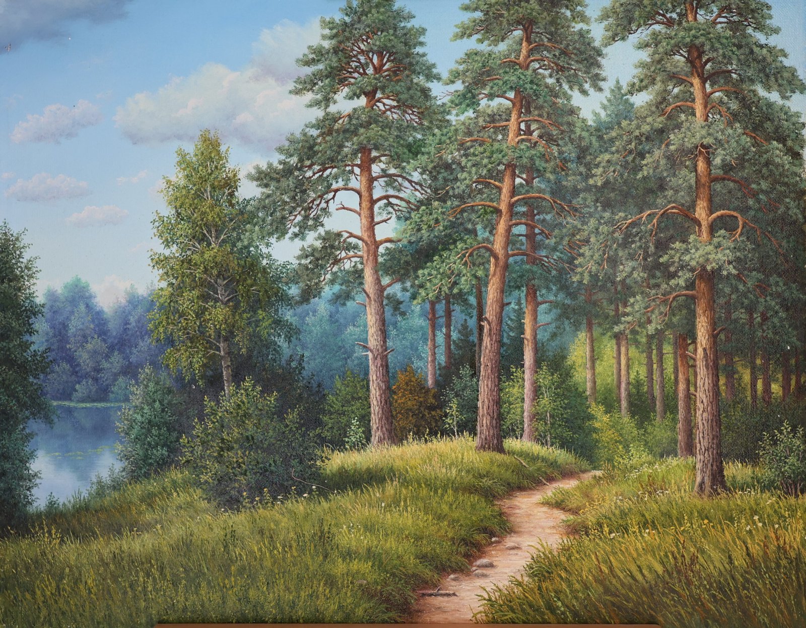 A serene forest path unfolds in the spirit of the Russian realist school, with every pine tree painted with lifelike precision. Inspired by Shishkin, the artist captures the grandeur and timeless harmony of nature.