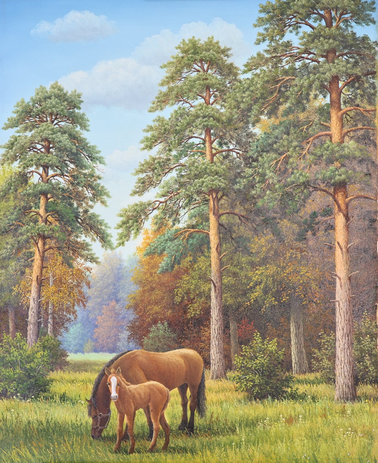 In the tradition of Shishkin, this tender landscape with a mare and foal reflects both strength and tranquility of nature. An artwork that brings warmth, peace, and timeless beauty to any interior.